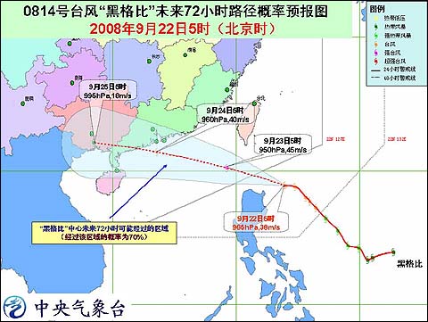 中新網(wǎng)9月22日電 據(jù)問天網(wǎng)消息,中央氣象臺(tái)今天早晨六時(shí)發(fā)布臺(tái)風(fēng)消息:今年第14號(hào)臺(tái)風(fēng)“黑格比”(HAGUPIT)的中心今天早晨5時(shí)其位于我國(guó)臺(tái)灣省恒春市東南方大約490公里的西北太平洋洋面上,就是北緯18.9度,東經(jīng)124.0度,中心附近最大風(fēng)力有13級(jí)(38米/秒)。