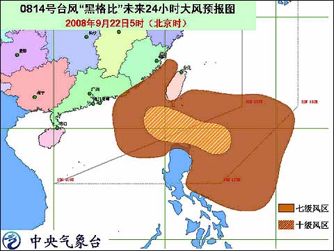 受“黑格比”的影響,今天白天到夜間,臺(tái)灣以東洋面、臺(tái)灣東南部沿海、臺(tái)灣海峽、福建中南部沿海、廣東東部沿海的風(fēng)力將逐漸加大到6-8級(jí),巴士海峽、巴林塘海峽、南海東北部海面的風(fēng)力可達(dá)8-10級(jí),“黑格比”中心經(jīng)過的附近海面的風(fēng)力可達(dá)11-14級(jí)。