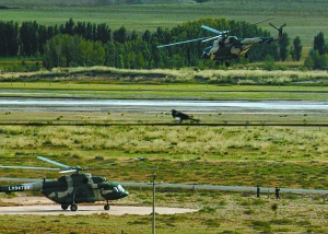 演練草場上空,最先出現(xiàn)一架綠色軍用直升機,緊接著又有兩架直升機列隊出現(xiàn),三架直升機在空中形成一個三角形向草場合攏。不遠(yuǎn)處,另外三架直升機也在進行低空搜索。