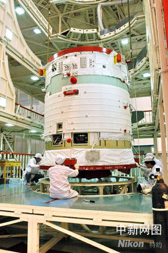 中國(guó)神舟七號(hào)載人航天飛船發(fā)射在即。飛船推進(jìn)艙起吊(資料圖片)。