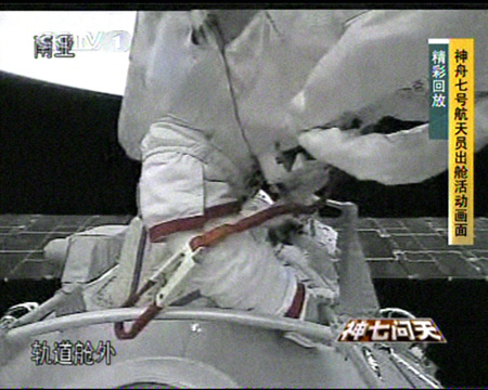 中新網(wǎng)9月27日電 中國(guó)“神七”載人飛船航天員翟志剛今天下午16時(shí)43分左右順利出艙,實(shí)施中國(guó)首次空間出艙活動(dòng)。他取下放置在軌道艙外壁上固體潤(rùn)滑材料試驗(yàn)樣品,遞給艙里的航天員劉伯明。