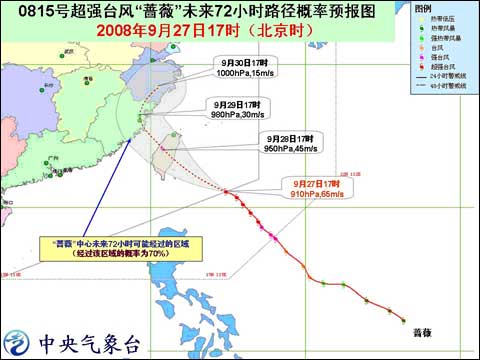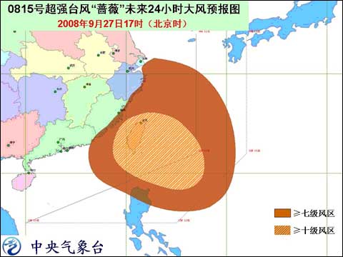 中新網(wǎng)9月27日電 據(jù)中國天氣網(wǎng)消息,中央氣象臺2008年9月27日18時發(fā)布臺風紅色警報稱:預計,今年第15號超強臺風“薔薇”將以每小時20-25公里的速度向西北方向移動,逐漸向臺灣東部一帶沿?拷,將于明天中午到夜間在臺灣宜蘭到臺東一帶沿海登陸。