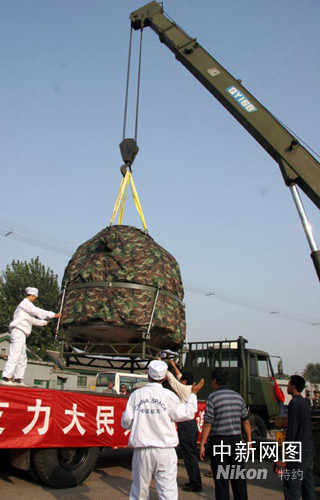 “神七”載人飛船返回艙運(yùn)抵北京。中新社記者 孫自法 攝