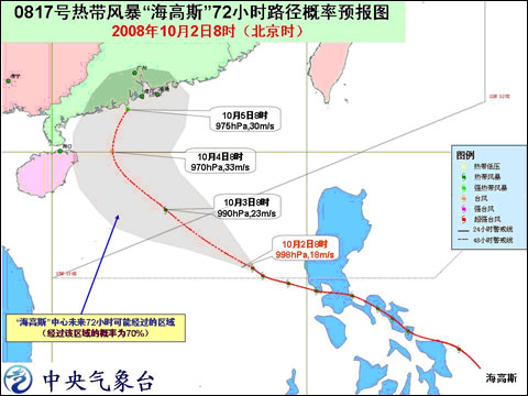 中新網(wǎng)10月2日電 據(jù)中國天氣網(wǎng)消息,中央氣象臺今天上午發(fā)布臺風(fēng)消息說,今年第17號熱帶風(fēng)暴“海高斯”(Higos)的中心已于昨天午夜前后進(jìn)入南海東部海面,今天上午8時(shí)風(fēng)暴中心位于廣東省珠海市南偏東方大約880公里的南海中部海面上,就是北緯15.4度,東經(jīng)117.9度,中心附近最大風(fēng)力有8級(18米/秒)。