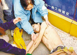 潘興聽到楊森喊,隨即看到林松嶺赤著上身很快跑過去,后面幾人在追。潘興回憶,當天林松嶺穿著一件黑色的小風衣,“外套是他自己脫掉的,但襯衫怎么沒有了我不知道!迸伺d追出去幾十米后,看到林躺在地上,身體蜷曲著。“我扒開正在打松嶺的人說別打了,后面就有人抓住我的頭發(fā)把我摁住,不知道有幾個人照著我的頭不停地踢!
