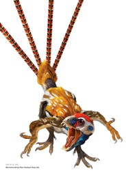 “胡氏耀龍”生活在侏羅紀(jì)時(shí)期,身體全長超過40厘米,屬于鳥翼類,代表了和鳥類關(guān)系最為接近的恐龍之一。不同于其他已知恐龍,“胡氏耀龍”長有4枚長約20多厘米的帶狀尾羽。更有意思的是,它的其他羽毛均未形成為類似鳥類飛羽的構(gòu)造,雖然“胡氏耀龍”的前肢長于后肢,形成了類似原始鳥類的前肢,但由于沒有飛羽,“胡氏耀龍”并不具有飛行能力。