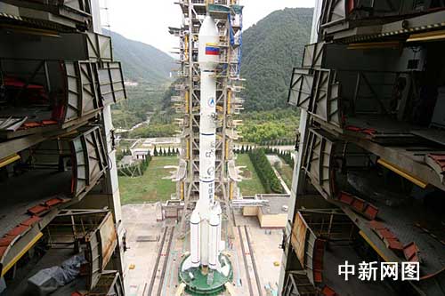 “委內(nèi)瑞拉一號(hào)”通信衛(wèi)星及“長征三號(hào)乙”運(yùn)載火箭星箭組合體倚立于發(fā)射塔架之畔,蓄勢(shì)待發(fā)。作者:尹濤