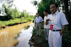 三位暗訪的省人大代表在排放口仔細(xì)觀察!斑@里肯定存在偷排污水現(xiàn)象,否則怎么會(huì)淤積這么厚的黑泥?”省人大環(huán)資委副主任委員潘大林說(shuō)。他還指給記者看,排放口上游河岸兩邊是黃泥,到下游就變成黑色,水面也開(kāi)始漂浮油污。