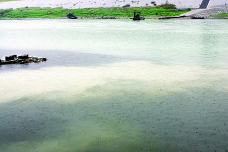 昨日上午11時(shí),記者可以清晰地看到河水的顏色分成好幾個(gè)層次,約五十米寬的河面上,最靠近岸邊的是黑色,再過去一點(diǎn)的是鮮明的乳白色,越往河心顏色越濃,整個(gè)河面呈現(xiàn)出白得發(fā)青的顏色,排水口還在不停地往河里排放乳白色、漂著白色泡沫的污水,早上的大雨也絲毫沒能沖散掉乳白色的河水。