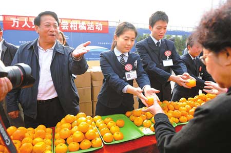 昨日(2日)上午,農(nóng)業(yè)部副部長陳曉華、副省長張作哈、省農(nóng)業(yè)廳廳長任永昌來到成都春熙路街頭廣場,帶頭吃下蜜柑,以此消除人們品嘗柑橘的顧慮。昨日由省農(nóng)業(yè)廳、成都市農(nóng)委、成都市商務局共同主辦的“萬人免費品嘗柑橘活動”在全市各大超市舉行。全省各柑橘主產(chǎn)地也同時開展了免費品嘗活動。