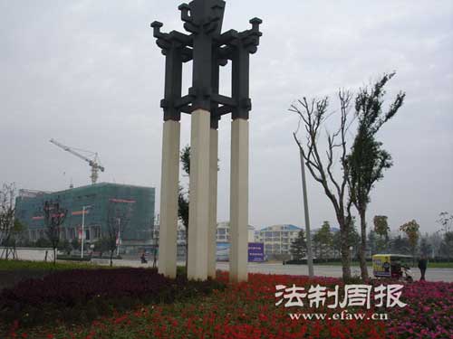在一街之隔,便是氣勢磅礴的盤古廣場。記者站在政府大樓前一眼望去,無法看到盡頭。廣場前是兩個雕塑,高約七八米,四根柱子托起一個倒金字塔。廣場的地面是由大塊石頭鋪成,一些地板上還雕刻了古代傳說中的龍鳳等神物。