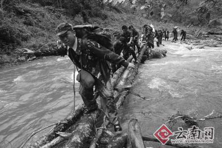 小心翼翼通過(guò)用樹(shù)木搭的橋