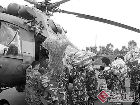 由于受災(zāi)較嚴(yán)重的地區(qū)均屬于偏遠(yuǎn)高寒山區(qū),通往災(zāi)區(qū)的道路全部中斷,短期之內(nèi)無(wú)法搶通,為及時(shí)將災(zāi)區(qū)急需的大量救援物資送達(dá)災(zāi)區(qū),楚雄彝族自治州請(qǐng)求省人民政府給予協(xié)調(diào)直升飛機(jī)支援災(zāi)區(qū)救援。省人民政府接到請(qǐng)求后,協(xié)調(diào)由成都軍區(qū)的3架直升機(jī)參加支援楚雄州重災(zāi)區(qū)應(yīng)急救災(zāi)工作。