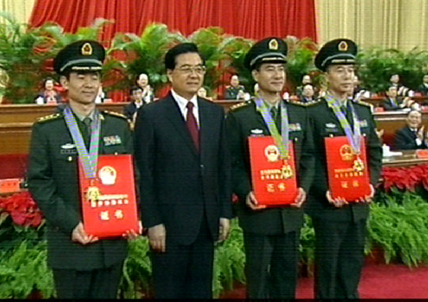 胡錦濤為翟志剛、劉伯明、景海鵬頒發(fā)獎章和證書