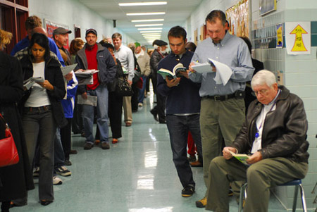等到孩子們真正長大可以投票的時(shí)候,他們在熱情高漲的同時(shí)又不乏理性。在呂芳的想像中,投票站應(yīng)該是兩方對壘,支持者搖旗吶喊才對。結(jié)果卻完全出乎他的預(yù)料。大選當(dāng)天,呂芳所在小組參觀的第一個(gè)投票點(diǎn)在弗吉尼亞Falls Church縣的一個(gè)社區(qū)活動中心。他們到那里時(shí)剛過6點(diǎn),投票點(diǎn)外已經(jīng)排起了長龍,蜿蜒足有一二百米。人群中,有人帶著蹣跚學(xué)步的孩子,有人坐著輪椅,有人自己帶著椅子……“但是,整個(gè)人群靜悄悄的,沒有一點(diǎn)激動人心的表現(xiàn)!