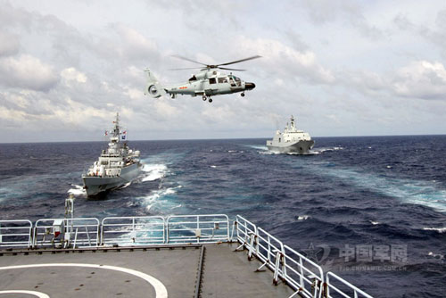 海上戰(zhàn)艦馳騁,空中戰(zhàn)鷹盤旋。11月上旬,南海艦隊組織支援艦、登陸艦、驅(qū)逐艦、護衛(wèi)艦、艦載直升機,首次在南沙附近海域開展了一次綜合作戰(zhàn)支援演練。他們在成功組織“兩橫一縱”海上補給訓練的同時,演練了艦載直升機起降、懸停、偵察、模擬救援等課目,使艦機協(xié)同能力有了新的提高。(中國軍網(wǎng)發(fā) 饒燕文攝)