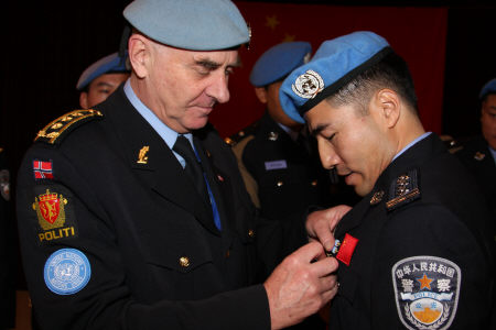 中新網(wǎng)11月18日電 11月16日,中國第五批駐科索沃維和警察榮獲聯(lián)合國維和勛章的授勛儀式在科首府普里什蒂納舉行。聯(lián)合國駐科索沃特派團(tuán)代理總警監(jiān)伊弗·弗里加德(左)在普里什蒂納給中國維和警隊隊長吳勝國佩戴聯(lián)合國維和勛章。