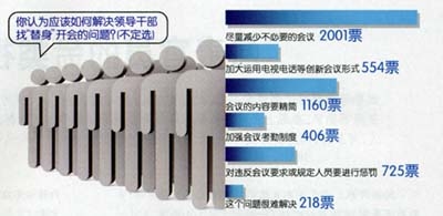“你認(rèn)為應(yīng)該如何解決領(lǐng)導(dǎo)干部找‘替身’開會的問題?”問卷調(diào)查結(jié)果顯示,65.03%的受調(diào)查者認(rèn)為“盡量減少不必要的會議”,37.7%的受調(diào)查者認(rèn)為“會議的內(nèi)容要精簡,有的放矢”,23.56%的受調(diào)查者認(rèn)為“對找‘替身’開會的現(xiàn)象加大管理力度,對相關(guān)人員要進(jìn)行懲罰”,18%的受調(diào)查者認(rèn)為“加大運(yùn)用電視電話等創(chuàng)新會議形式”。由此可見,表示應(yīng)減少會議或精簡會議內(nèi)容的占到受調(diào)查者的88.59%。