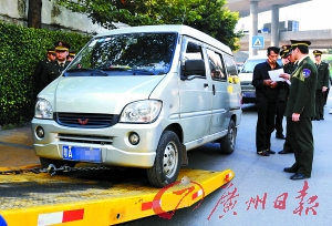 執(zhí)法人員昨日對(duì)一輛查獲的非法營(yíng)運(yùn)車輛依法進(jìn)行處理。 記者王燕攝