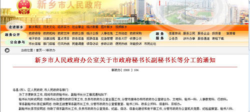 記者隨后登陸新鄉(xiāng)市人民政府門(mén)戶網(wǎng)站,在市政府文件一欄,發(fā)現(xiàn)了該市2008年10月通過(guò)的《新鄉(xiāng)市人民政府關(guān)于市長(zhǎng)副市長(zhǎng)市長(zhǎng)助理等分工的通知》和《新鄉(xiāng)市人民政府辦公室關(guān)于市政府秘書(shū)長(zhǎng)副秘書(shū)長(zhǎng)等分工的通知》兩個(gè)文件,文件表明,河南省新鄉(xiāng)市設(shè)有11名副市長(zhǎng);1名秘書(shū)長(zhǎng),16名副秘書(shū)長(zhǎng);此外還有6名調(diào)研員協(xié)助副市長(zhǎng)工作。 (荊楚網(wǎng))