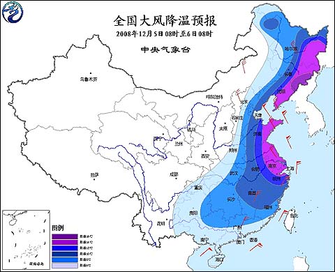 2008年12月5日08時(shí)全國大風(fēng)降溫預(yù)報(bào)圖