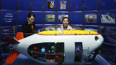 一條可愛的胖魚、卻張開著兩只大手臂,魚肚子里還趴著3個(gè)人,這是代表我國深?萍嫉7000米載人深潛器“和諧號(hào)”的最新樣機(jī)模型,昨天,在同濟(jì)亮相的這一海底“神七”通過演示臺(tái)展示了其操作原理。