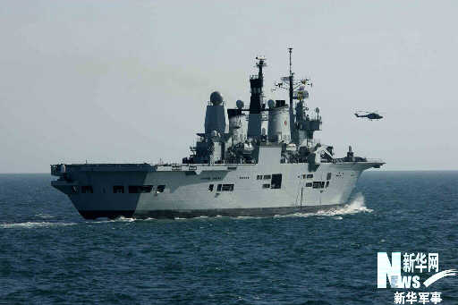 參加聯(lián)合演的英國海軍“皇家方舟”號航母艦和“山貓”直升機(jī)。查春明 攝