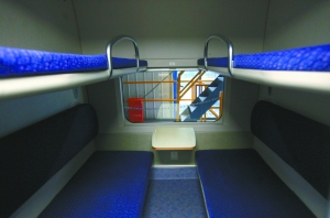 每節(jié)車廂被分割成10個獨(dú)立包廂,寬敞的包廂里上下鋪共有4張床位,每個床腳都有獨(dú)立電視,包廂門口還加裝了呼叫系統(tǒng)。將于本月21日首發(fā)的京滬、京杭臥鋪動車組,增加了大量人性化設(shè)計(jì)。昨日,本報記者提前上車探訪了這趟國內(nèi)最高級的臥鋪車。