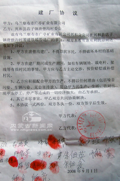 興和縣店子鎮(zhèn)蘆葦溝行政村村主任師振高與烏蘭察布市廣亭公司簽了一份協(xié)議,內(nèi)容大意是這個公司可以在當(dāng)?shù)夭设F礦,但要保證當(dāng)?shù)鼐用癜踩!這份看似毫無意義的協(xié)議卻在當(dāng)?shù)厥钟行,村民都認為這是合法的采礦企業(yè),而企業(yè)也變得更加大膽,并在村主任的協(xié)調(diào)下與村民以兩千元一畝的價格購下了唐僧溝村舊村址,說要建成一個大中型的鐵礦石浮選廠。