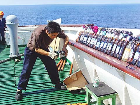 這時(shí)我們的船員都退到了生活區(qū),因?yàn)橹骷装宓今{駛樓下生活區(qū)有6米高的落差,兩者中間的兩架鐵梯已經(jīng)事先被割斷了,我們也將生活區(qū)的門(mén)封住了,海盜進(jìn)不來(lái)。我在駕駛樓里通知所有的船員說(shuō),一定不要暴露自己的身體,然后大家將艙里的幾百個(gè)啤酒瓶裝上了油漆水,點(diǎn)著了,拼命朝甲板上扔,海盜哇哇大叫。