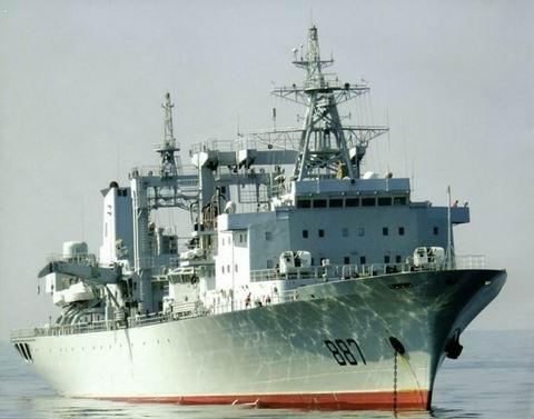 “微山湖”號綜合補(bǔ)給艦(舷號887)是中國自行設(shè)計(jì)建造的最大補(bǔ)給艦,排水量接近3萬噸,可同時(shí)為兩艘以上艦船補(bǔ)給,2007年曾與“廣州”艦一起出訪歐洲多個(gè)國家。
