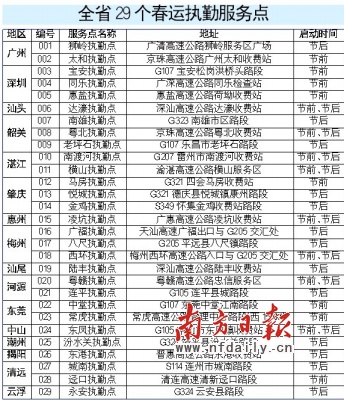 春運期間,將在主干公路上設立29個由省廳掛牌的春運執(zhí)勤服務點(見右表)。服務點由當?shù)毓矙C關派民警日夜駐守,重點檢查7座以上營運客車和危險化學品運輸車輛,嚴格查處客車超員和無牌無證、報廢車上路行駛以及農(nóng)用車、拖拉機載人等嚴重交通違法行為,其中節(jié)前春運執(zhí)勤服務點要從1月5日起即開始運作。各地市還根據(jù)實際在主干公路和交通流量大的路段設置119個春運執(zhí)勤服務點,配備足夠的警力和裝備。如果駕駛員在旅途中遇到問題,可以及時通過這些執(zhí)勤服務點向有關部門求助。