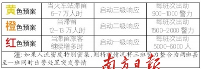 為確保2009年春運的安全,廣州警方認(rèn)真總結(jié)和吸取2008年處置廣州火車站地區(qū)因旅客大量聚集造成嚴(yán)重安全危機的經(jīng)驗和教訓(xùn),精心制定了2009年春運安全保衛(wèi)工作系列方案。其中,針對火車站地區(qū)可能再次出現(xiàn)的因火車延誤或鐵路中斷造成大量旅客滯留的情況,制定了“黃、橙、紅”三個級別的應(yīng)急響應(yīng)方案和最高級別最大力量的調(diào)警方案。