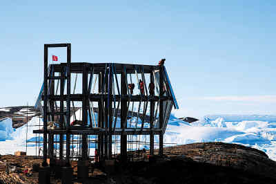 溫度、風速、氣壓這些天氣數(shù)據(jù)實時地顯示在餐廳內(nèi)的液晶電視屏幕上。這兩天早上的風刮得都比較緊,今天的風就有六七級,陣風8級。地處東南極大陸沿海,中山站正在南極大陸平均風力最大的區(qū)域內(nèi)。去年冬天最大風速曾達到40多米每秒。中山站改造項目經(jīng)理劉篤斌決定等風小一些再讓隊員們?nèi)ヅ栏吒苫。對于站上接二連三立起來的鋼結(jié)構(gòu)新樓,老劉一拍胸脯說,“基礎(chǔ)打得特別深,再大的風也能頂?shù)米!?/p>