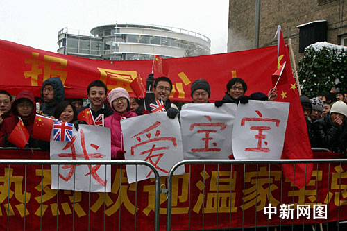 中新網(wǎng)倫敦2月2日電(記者 張朔)當(dāng)?shù)貢r間二月二日下午,即將結(jié)束訪英和訪歐行程的中國總理溫家寶踏雪到訪劍橋大學(xué),受到學(xué)子們的熱烈歡迎。有的學(xué)生甚至還打出了中文標語:“我愛寶寶。”