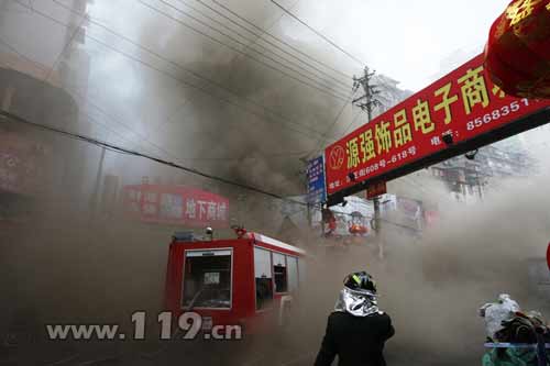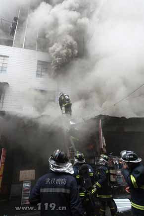 當(dāng)日上午9時(shí)51分,武漢市119指揮中心接到火災(zāi)報(bào)警后,立即調(diào)集21個(gè)消防中隊(duì)、79臺(tái)消防車(chē)、322名消防官兵趕赴現(xiàn)場(chǎng)進(jìn)行撲救。發(fā)生火災(zāi)的華貿(mào)商城為一幢9層商住樓,一樓為經(jīng)營(yíng)門(mén)面、2樓和3樓為倉(cāng)庫(kù),4樓以上為居民住宅。