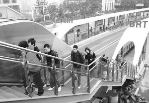 整座人行天橋以直跑樓梯連接通江南路兩側(cè)人行道,天橋中部則與BRT站臺(tái)以斜式扶手滾動(dòng)電梯和直跑鋼梯相連接。而人行天橋兩部專(zhuān)供殘疾人使用的玻璃體房垂直升降電梯已經(jīng)全部安裝到位,只不過(guò)電梯出口處的包裝紙還緊緊地粘在上面。