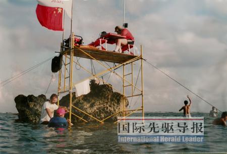 見此情景,中國隊(duì)員非常憤怒,一位隊(duì)員立即將中華人民共和國國旗插到了無線電平臺(tái)的頂端!澳蔷褪窃谔翎,黃巖島是我們的領(lǐng)土,看到五星紅旗高高飄揚(yáng),我們心里別提有多激動(dòng)!标惙礁嬖V《國際先驅(qū)導(dǎo)報(bào)》:“我們不能忍受他們對中國主權(quán)的挑釁,這是原則問題,當(dāng)時(shí)幾位年輕的隊(duì)員已經(jīng)作好準(zhǔn)備,如果菲律賓人敢將國旗插到礁石上,他們就要過去拔掉!