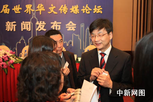 現(xiàn)在,我代表“第五屆世界華文傳媒論壇”組委會(huì)宣布:由國(guó)務(wù)院僑辦、上海市人民政府和中國(guó)新聞社共同主辦的“第五屆世界華文傳媒論壇”,將于今年九月十九日至二十一日在上海舉辦。