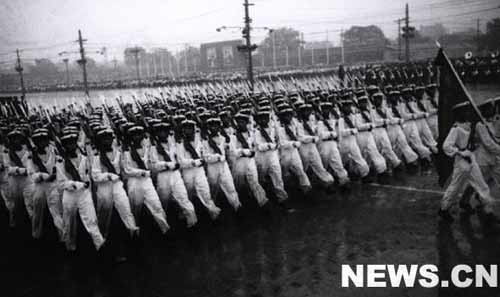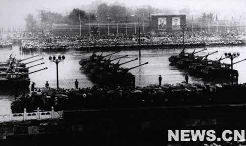 接著,分列式開始。軍事學(xué)院、步兵學(xué)校、炮兵學(xué)校、工程兵學(xué)校、坦克學(xué)校、航空學(xué)校、海軍學(xué)校的隊伍和水兵、公安軍、步兵師、摩托化步兵、傘兵、炮兵部隊、坦克部隊相繼通過了天安門廣場。