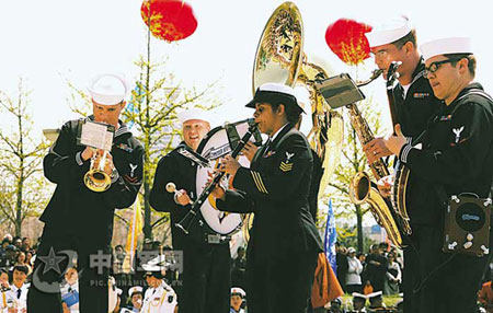 美國海軍派出的7人小樂隊(duì)音色韻味十足,一上場,就掀起一陣熱潮。樂手們情不自禁地走到樂池邊,近距離為觀眾演奏了5首樂曲。