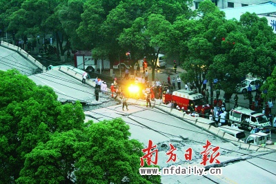 當(dāng)時(shí),數(shù)聲巨響鉆進(jìn)株洲市民李先生的耳朵。辦公室的同事隨即放下手中的工作,擠在窗口急切地想看下面發(fā)生了什么。一位女同事指向紅旗廣場的方向,用驚恐的聲音告訴他們“垮橋了”。李先生放眼望去,垮橋的地點(diǎn),距離他辦公室不過數(shù)百米的紅旗廣場附近。
