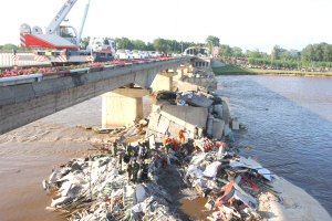 李慶生說,經(jīng)過對事故現(xiàn)場初步認定,事故原因是一輛超載的拉鋼材掛車壓塌橋體造成的。鐵力市交通局局長李善忠說,雖然車掉進了河里,無法準確測定它載了多少噸貨物,但經(jīng)過現(xiàn)場初步調(diào)查來看,這輛大貨車運載著的鋼材和建筑材料,至少超過60噸。