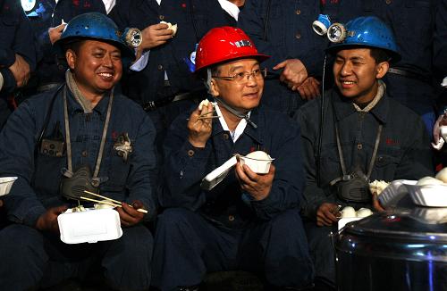 臨近中午12時(shí),從早上7時(shí)就下到礦井里工作的工人們要吃中飯了。在巷道里,溫家寶坐在枕木上與工人們一起用餐。他一邊吃飯,一邊詢問工人們的生產(chǎn)生活情況。他對(duì)大家說,中國(guó)是世界上最大的產(chǎn)煤國(guó),應(yīng)該有世界上最先進(jìn)的礦井、最先進(jìn)的技術(shù)和設(shè)備、最優(yōu)秀的產(chǎn)業(yè)工人。在應(yīng)對(duì)國(guó)際金融危機(jī)時(shí),一定要把煤炭生產(chǎn)搞好。必須正確處理保增長(zhǎng)與安全生產(chǎn)的關(guān)系,任何時(shí)候安全生產(chǎn)都是第一位的,在安全生產(chǎn)中實(shí)現(xiàn)經(jīng)濟(jì)平穩(wěn)較快增長(zhǎng)。同時(shí),要下決定引進(jìn)新技術(shù),大力推進(jìn)清潔生產(chǎn),讓煤炭生產(chǎn)質(zhì)量和效益走在世界的前列。溫家寶在礦井下呆了兩個(gè)小時(shí),才與礦工們惜別。