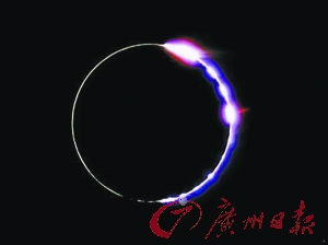 二、貝利珠璀璨奪目。緊接著出現(xiàn)一串發(fā)光的亮點,像一串璀璨奪目的“珍珠”,它們高懸于漆黑的天空,這是日全食展現(xiàn)的又一件異寶——貝利珠,通常只出現(xiàn)一兩秒。