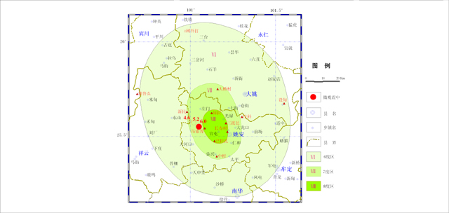 2. Ⅷ度區(qū)主要分布在姚安縣境內(nèi),北自左門(mén)鄉(xiāng)仰拉村以北,南到官屯鄉(xiāng)巴拉扎,東起三渡邑、長(zhǎng)壽村一帶,西至官屯鄉(xiāng)吊索箐,面積約230平方千米。