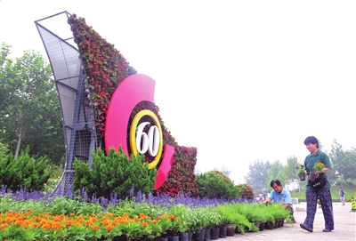 記者在現(xiàn)場看到,經(jīng)過幾個晝夜的施工,“普天同慶”花壇已經(jīng)完全呈現(xiàn)出主題,紅、綠、黃等顏色的鮮花不僅烘托著國慶的喜慶氣氛,還巧妙地構(gòu)建出“60”的國慶造型,而用鮮花組成的六個大圓球以及紅旗更讓游客稱贊不已。