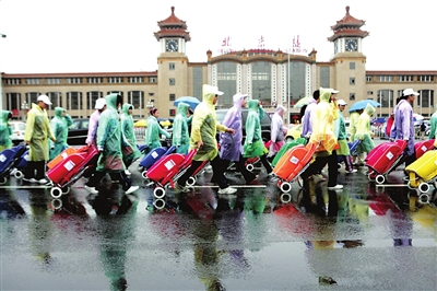 在天安門前,每隔8米一個(gè)崗哨,每個(gè)武警的腳下,都放著一個(gè)裝著雨衣的布包。下午4點(diǎn)半,因降雨變大,不但武警穿上了深綠色雨衣,長(zhǎng)安街沿街的所有音響也都套上了“雨衣”。
