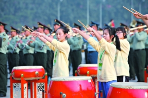 昨日下午3點開始,聯(lián)合軍樂團和合唱團、民族打擊樂團共4000余人在聯(lián)合軍樂團駐地進行了合練。記者在現(xiàn)場看到,廣場樂聲悠揚,氣氛熱烈。一些大學(xué)生合唱團成員從各自高校乘大巴趕至郊外,有些學(xué)生暈車剛吐完就上場加入合練。