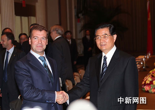 梅德韋杰夫說,一年之內(nèi),這已是我們第四次會(huì)面,非常高興能夠再次與胡錦濤舉行會(huì)見。